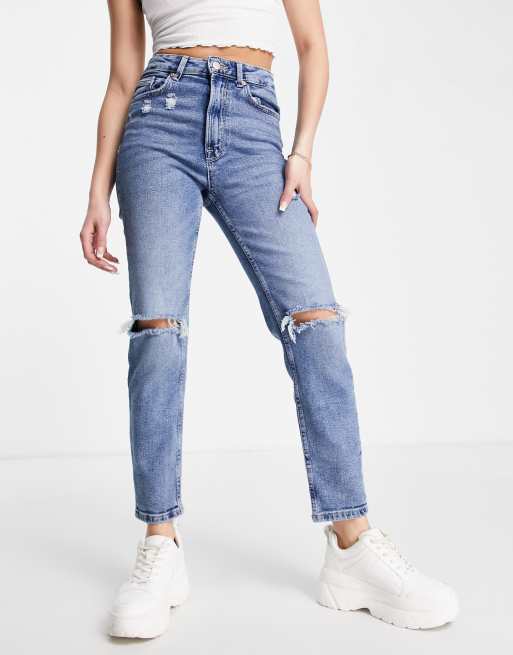 Asos mom jeans clearance review, Stradivarius slim mom jean with stretch and rip in authentic blue clearance