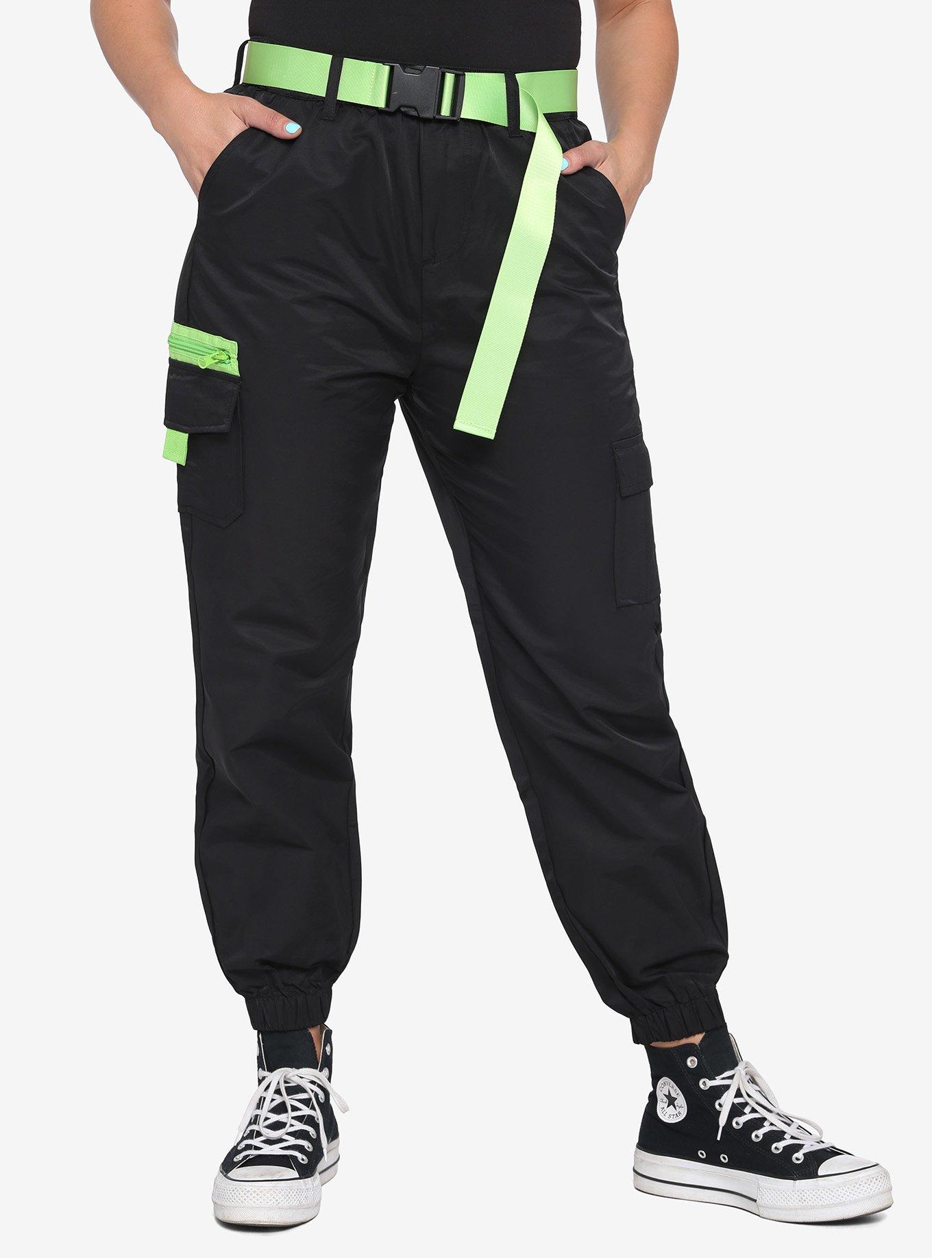 Black Neon Green Contrast Belted Cargo Jogger Pants