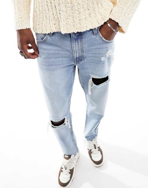 Asos light wash clearance jeans, ASOS DESIGN classic rigid jeans with rips in light wash blue clearance