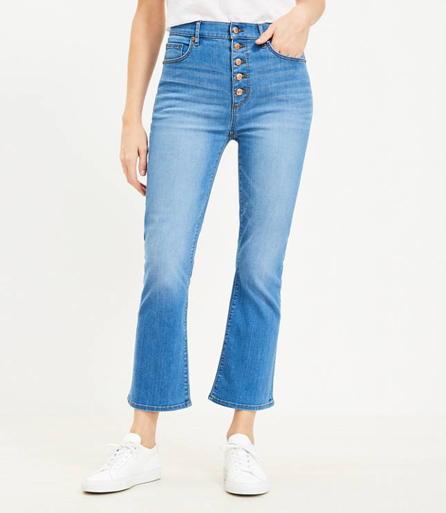 Petite Button Front High Rise Kick Crop Jeans in Bright Mid Indigo