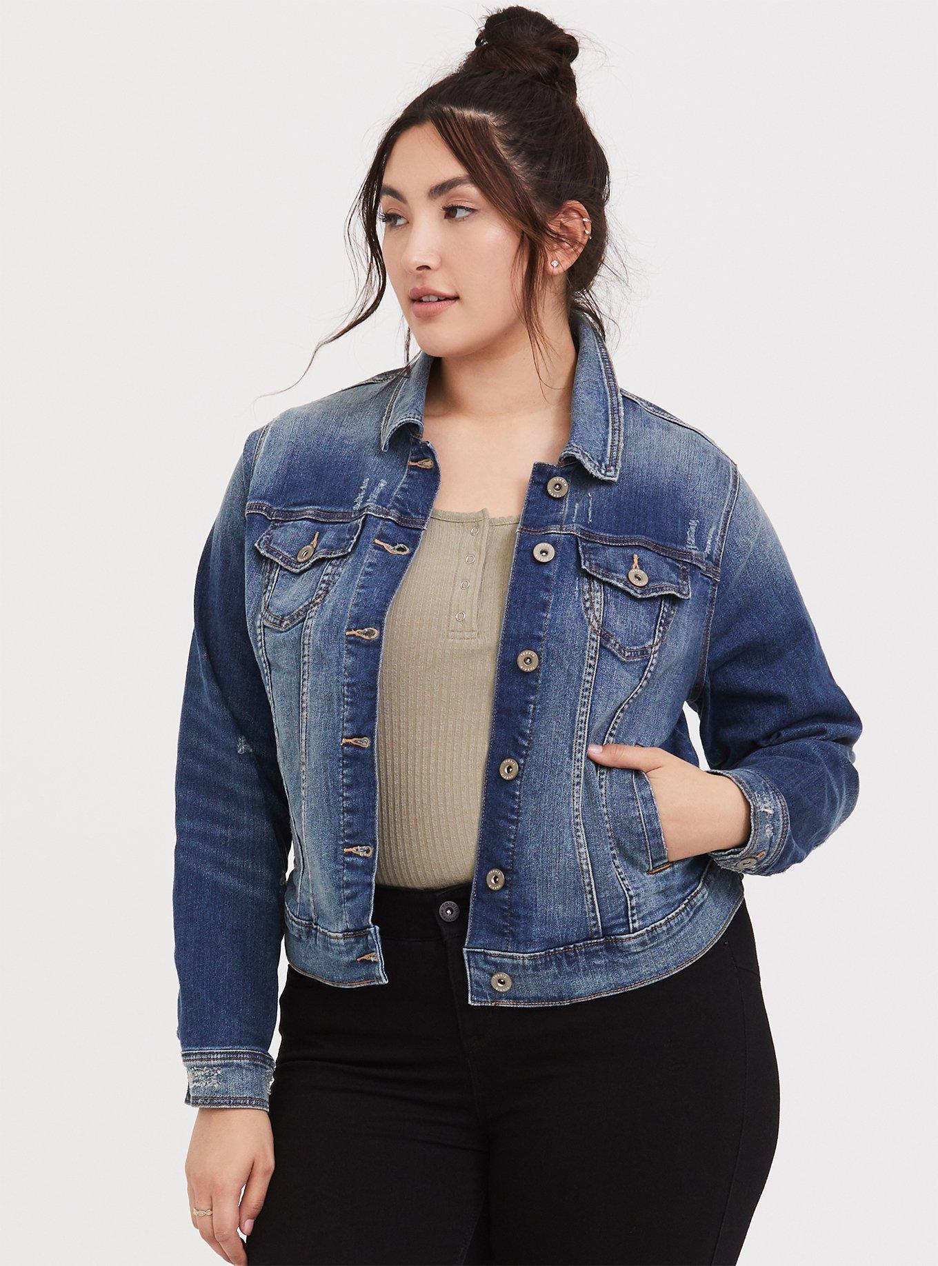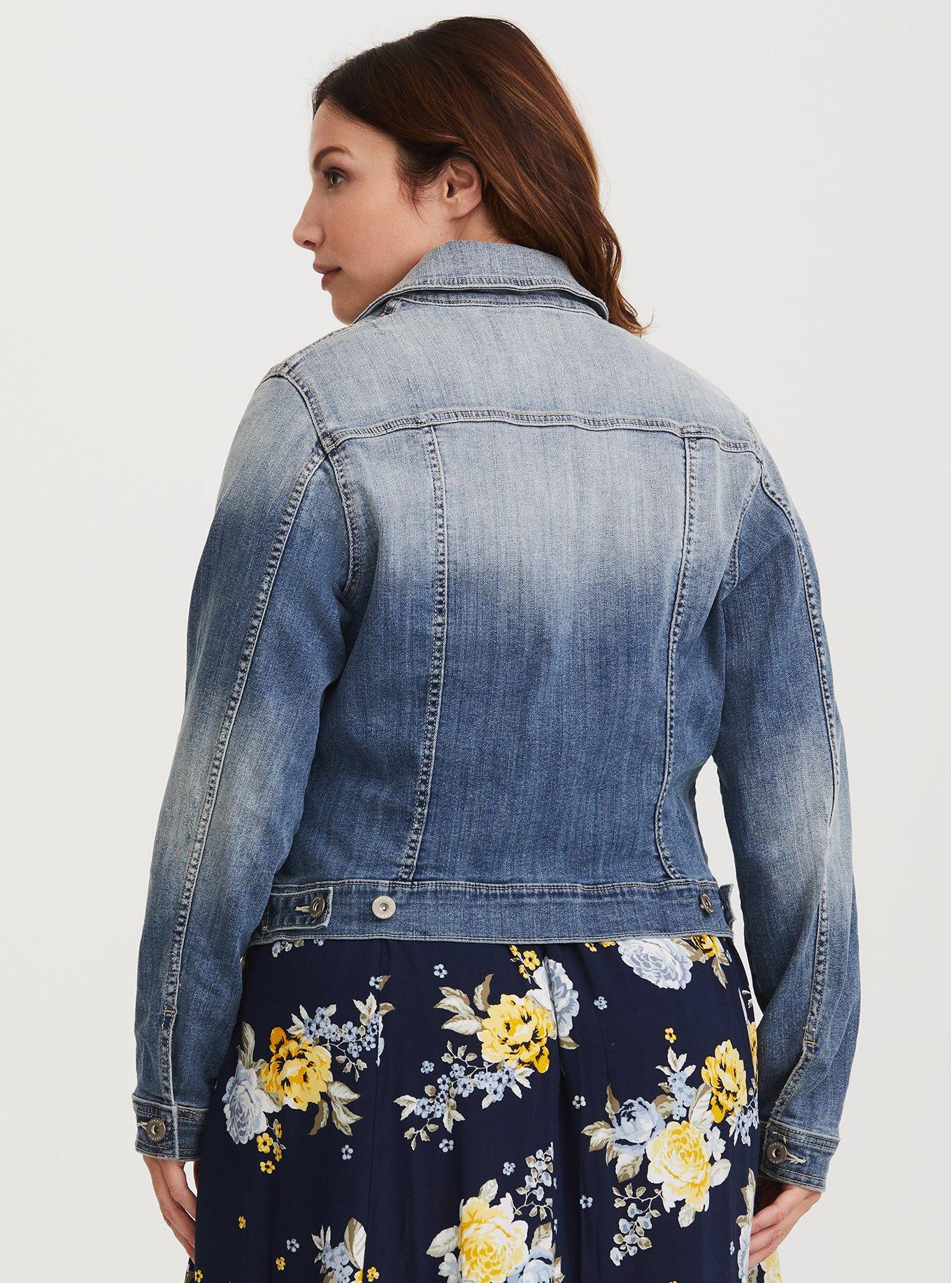 Plus Size Medium Wash Distressed Denim Trucker Jacket Torrid