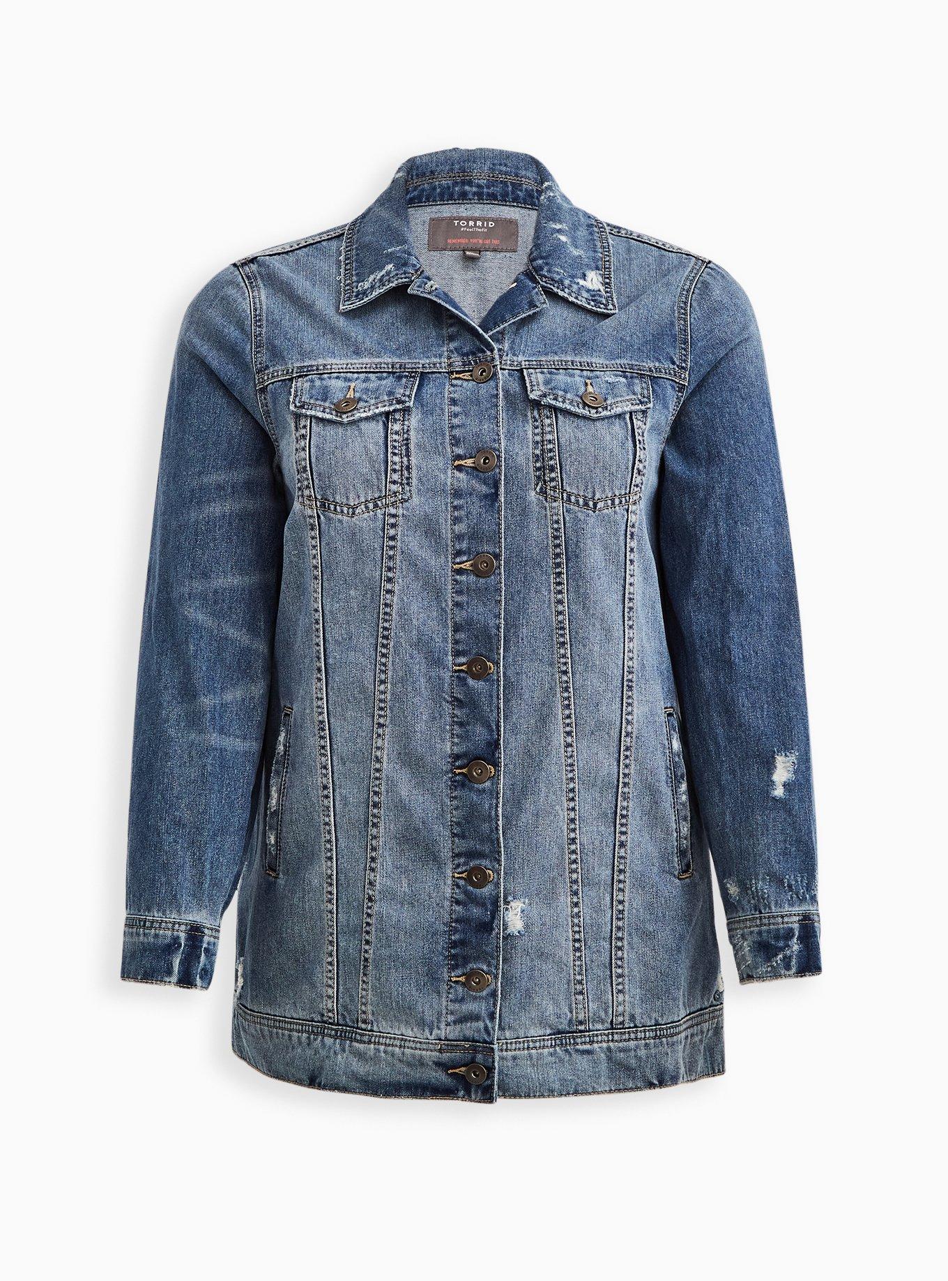 Torrid distressed jean clearance jacket, Plus Size Medium Wash Longline Denim Jacket Torrid clearance