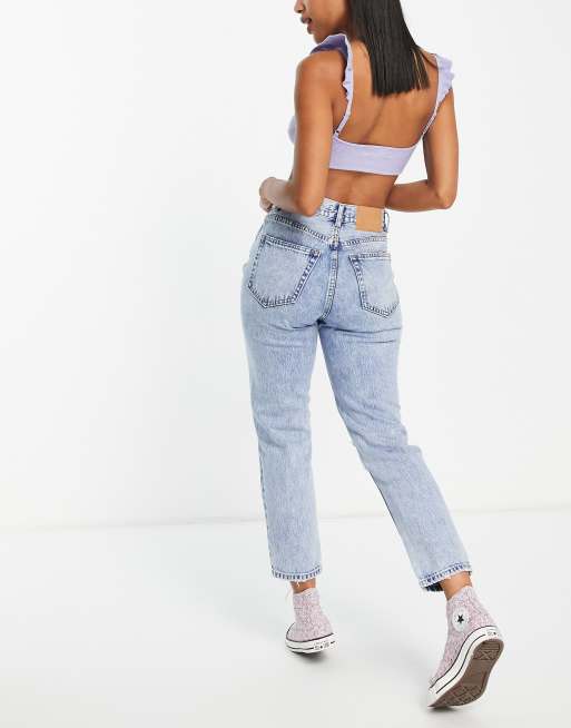 Pull & bear clearance mom jeans, Pull Bear high waisted mom jeans with rips in medium blue ASOS clearance
