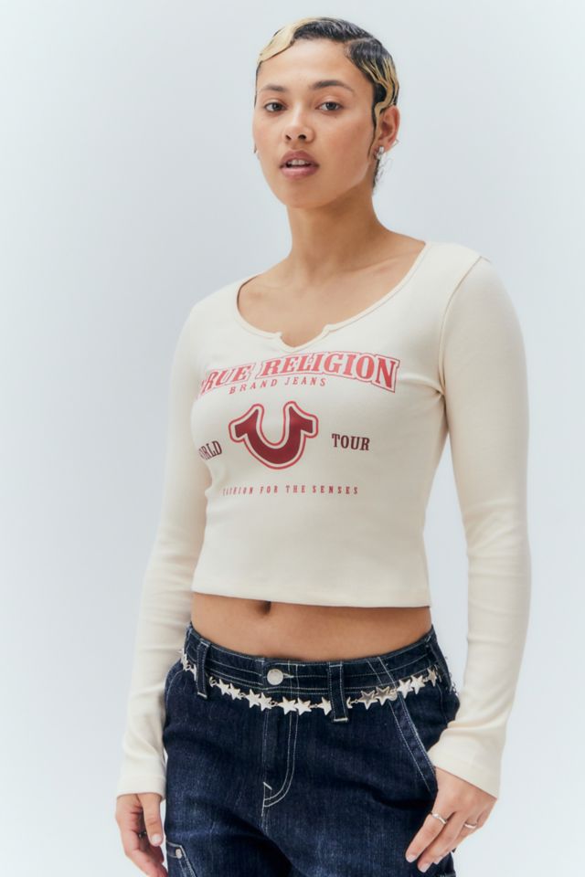 True Religion Ecru Notched V Neck Long Sleeved T Shirt