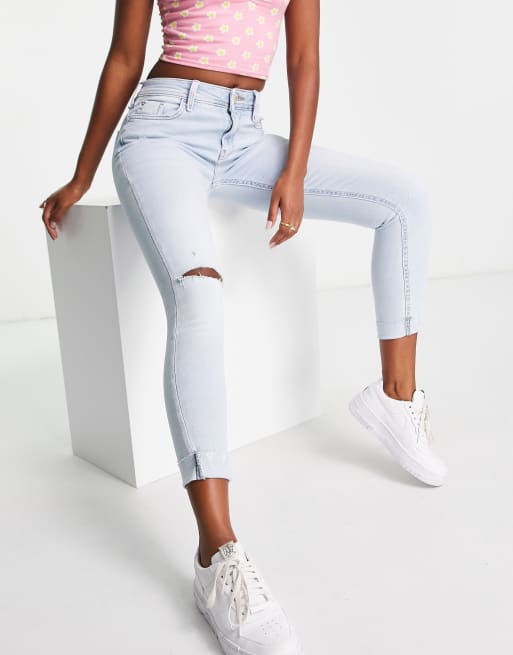 River Island ripped knee raw turnup skinny jeans in light blue ASOS
