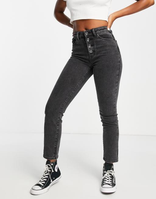 Only Emily high waisted straight leg jeans with exposed buttons in black