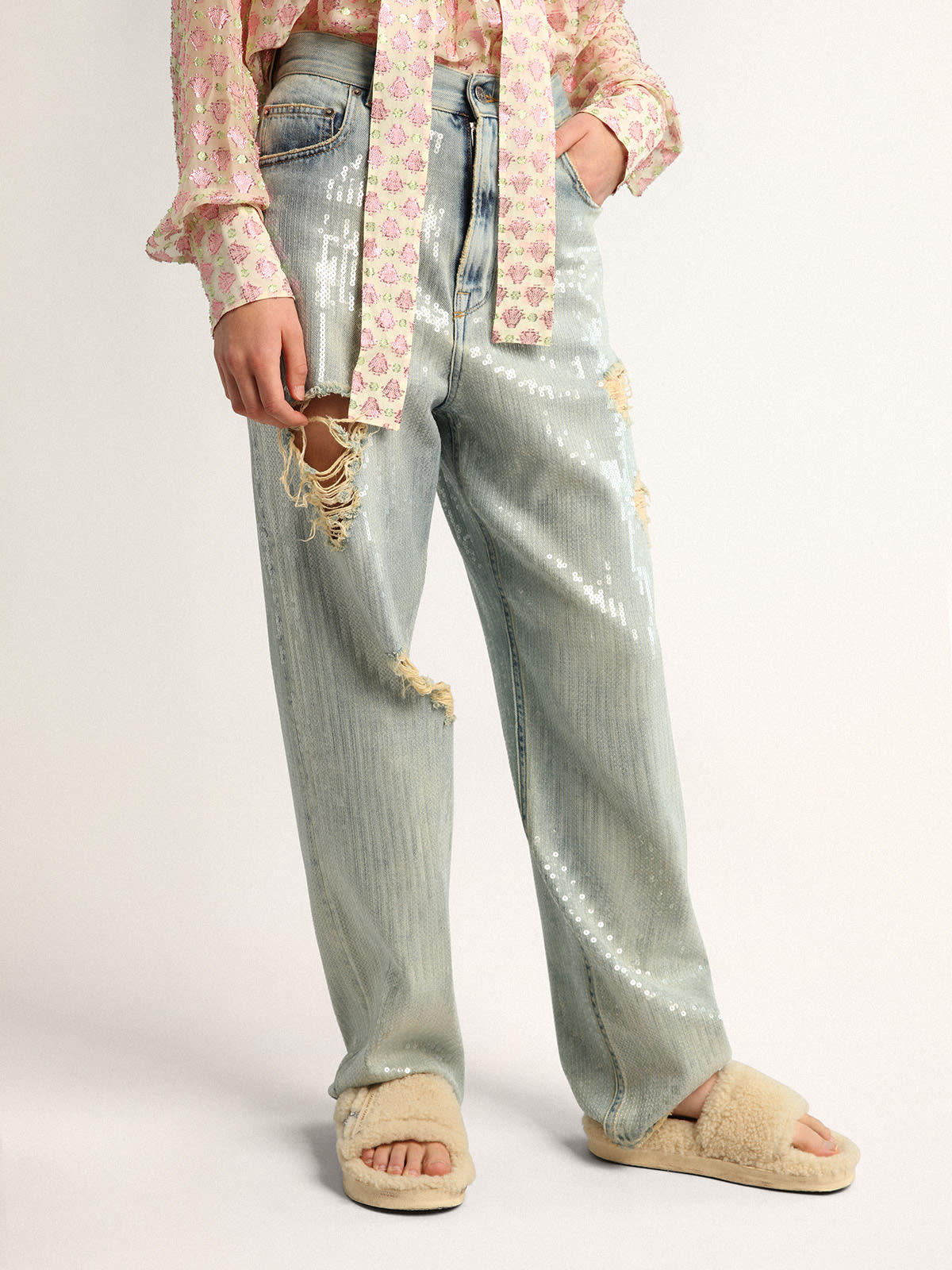 Distressed sequin denim clearance jeans, Journey Collection jeans in distressed effect light blue denim clearance