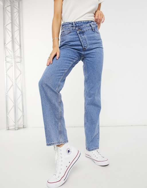 New Look asymmetric button detail straight leg jeans in mid blue
