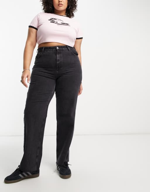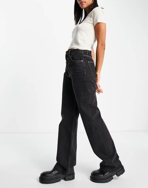 Pull Bear straight leg high waist jeans with frayed hem in black with contrast detail
