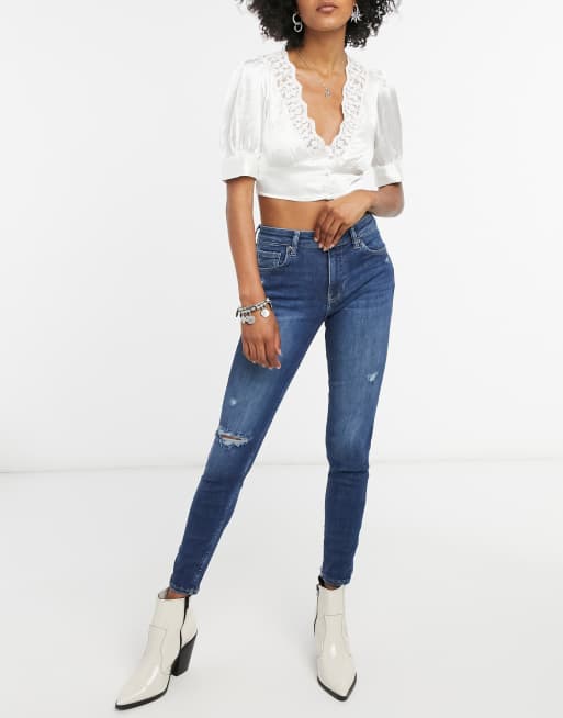 Bershka skinny push up jean with knee rip in dark blue wash
