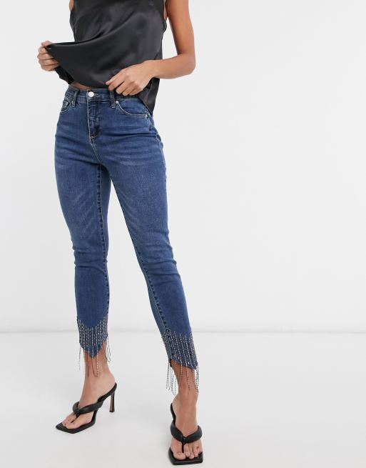 Blue Revival skinny jeans with rhinestone tassels in mid wash blue