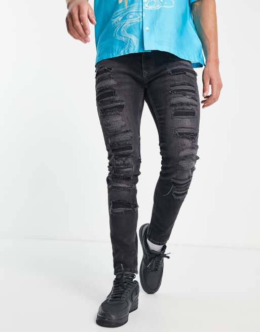 Topman extreme rip stretch skinny jeans in washed black ASOS