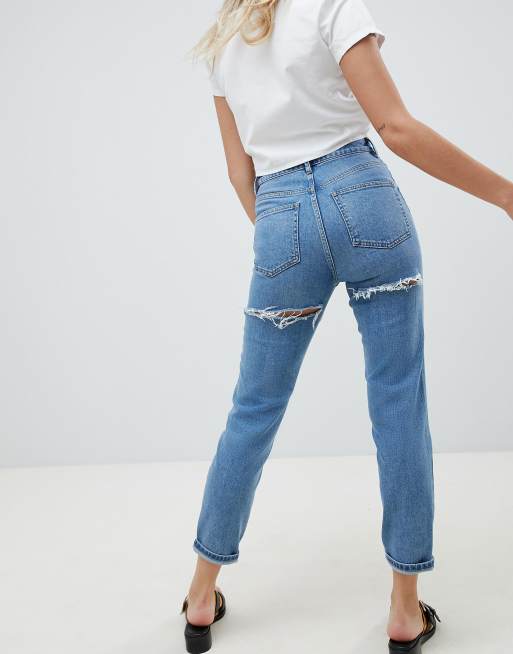 Asos design farleigh high waist slim clearance mom jeans in light stone wash, ASOS DESIGN Farleigh high waist slim mom jeans in ariel light stone wash with bum rips clearance
