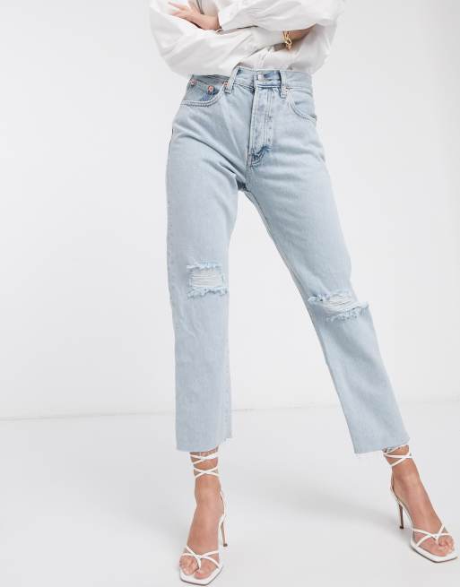 Mango Brooks Ripped High Rise Straight Jeans Blue 4