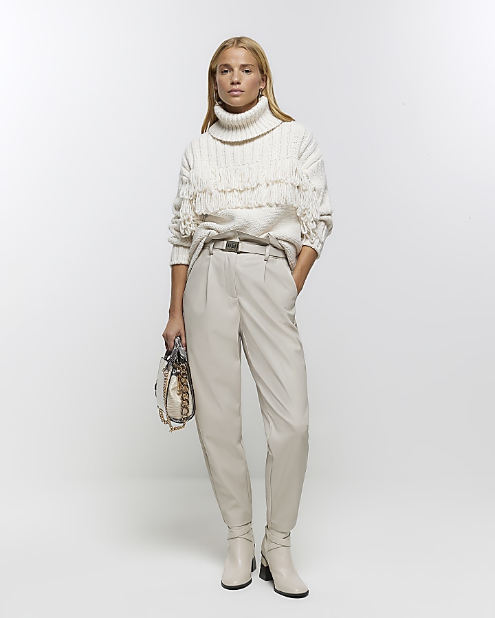 Cream Faux Leather Seam Detail Straight Leg Trousers