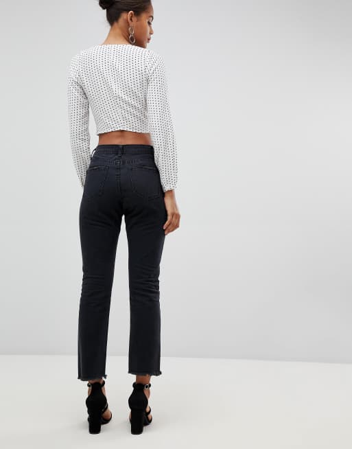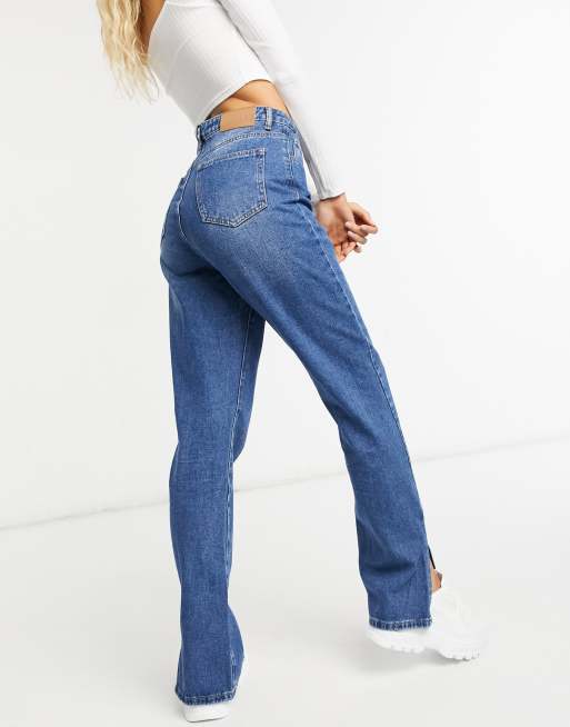 Missguided high waisted Wrath straight leg jean with split hem in blue