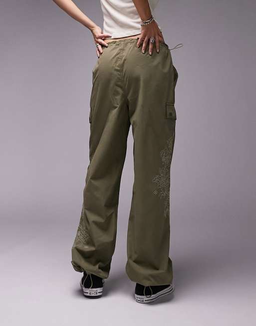 Topshop embroidered parachute balloon low rise cargo trousers in khaki