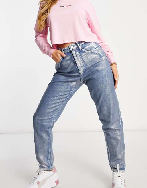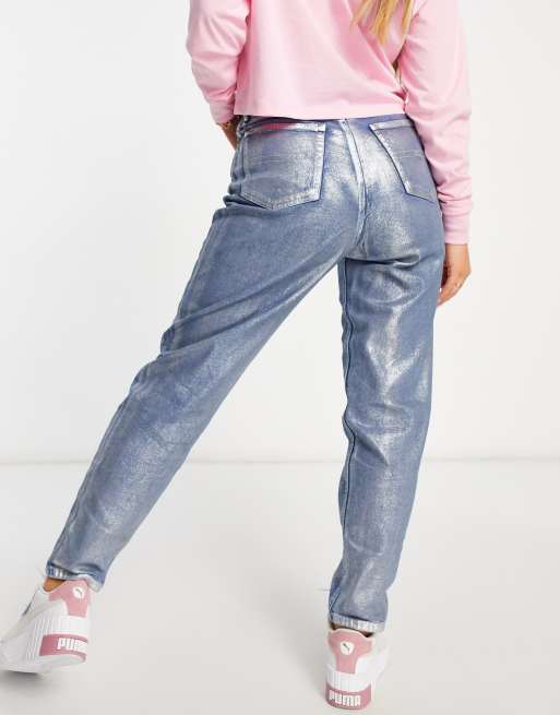 Tommy Jeans high rise silver metallic coated mom jean in blue