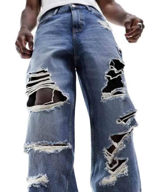 ASOS DESIGN baggy jeans with heavy rips in darkwash blue