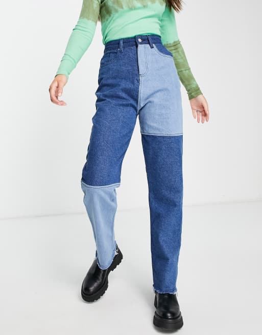 ASOS DESIGN mid rise 90s straight leg jean in blue patchwork