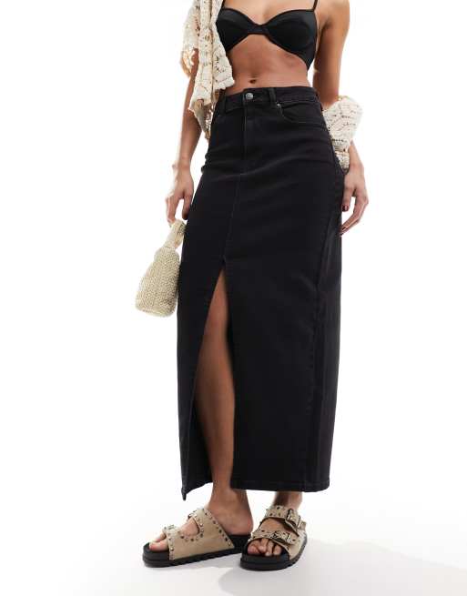 ASOS DESIGN denim maxi skirt with split hem in washed black