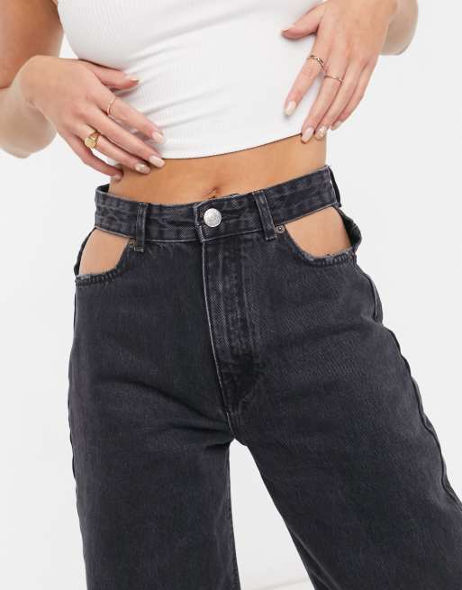 Washed Black Strappy Cut Out Hip Straight Leg Jeans