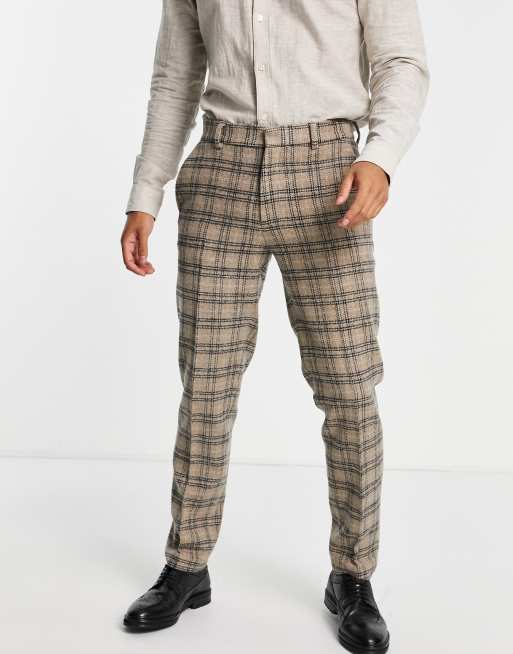 Beige clearance tartan pants, Beige prince of wales cotton linen flat front lightweight Wide leg clearance