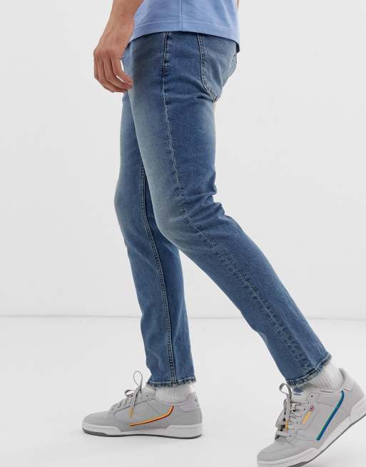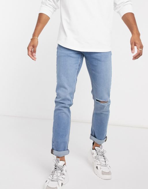 Pull Bear slim fit jeans with rips in mid blue ASOS