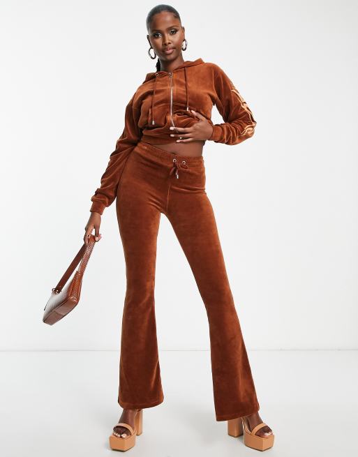 ASYOU embroidered velour flare trouser co ord in tan