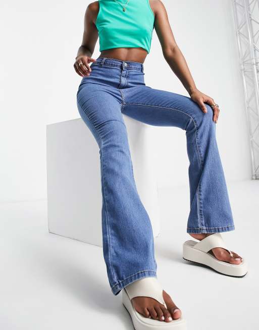 DTT Bianca high waisted flare disco jeans in mid blue ASOS