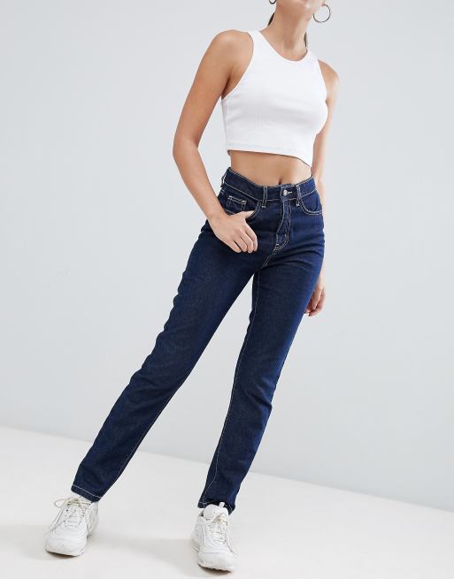 Noisy May dark wash contrast stitch mom jean in blue