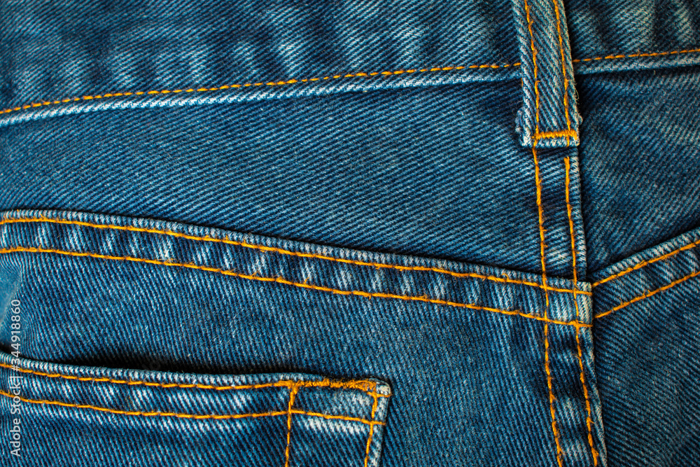 Jeans with yellow clearance stitching, Back pocket and belt loop on blue jeans with yellow stitching clearance