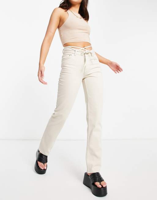 ASOS DESIGN mid rise straight leg jeans in ecru with strap detail