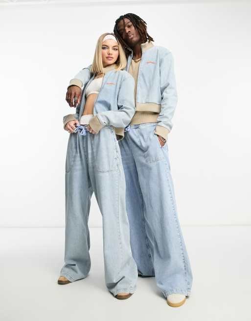 COLLUSION Unisex wide leg jeans with stitched branding co ord in light blue