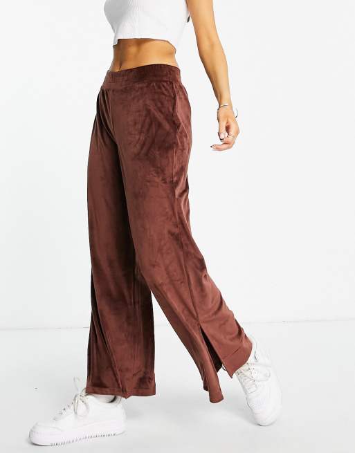 Threadbare Florida velour straight leg trousers with side split in chocolate brown