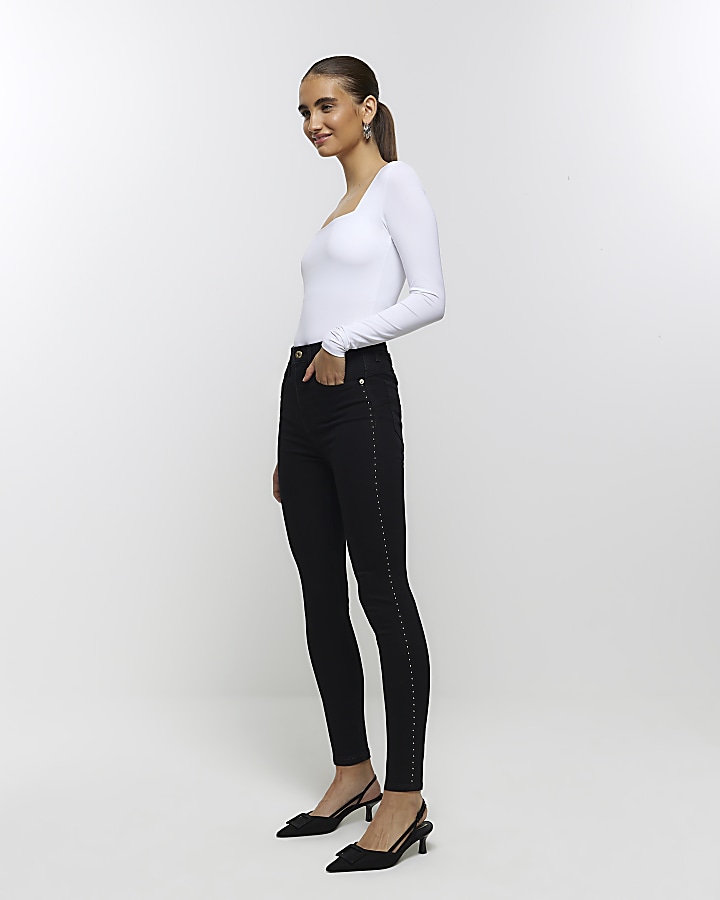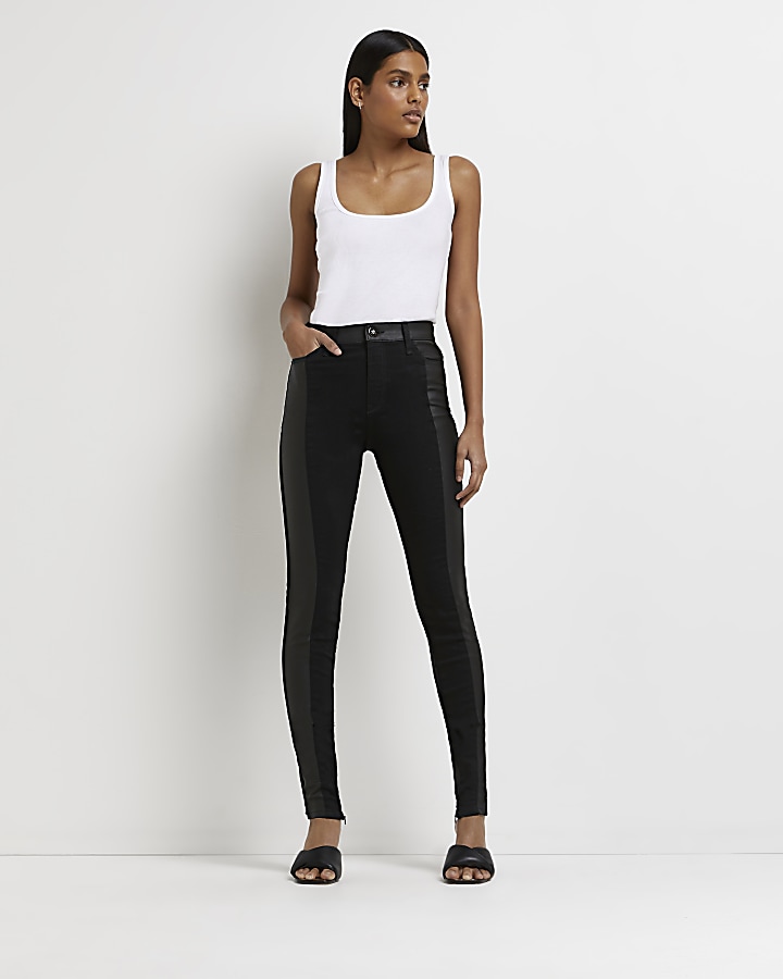 Black skinny jeans clearance with belt loops, Black faux leather paneled skinny jeans River Island clearance