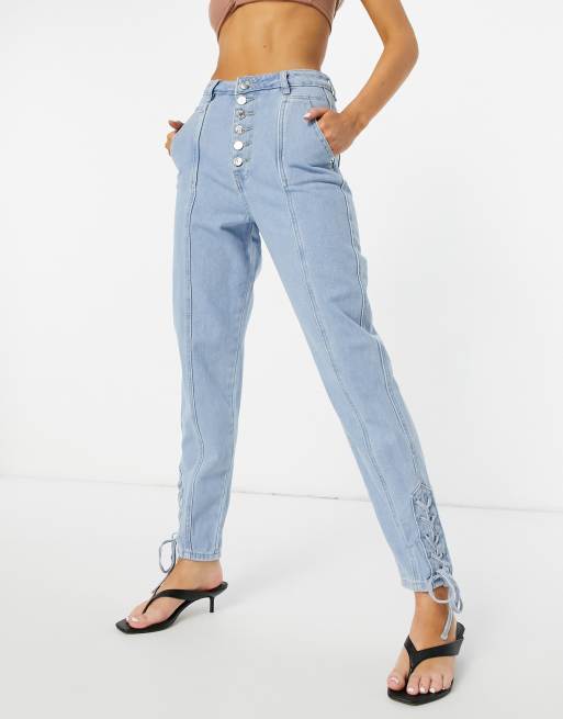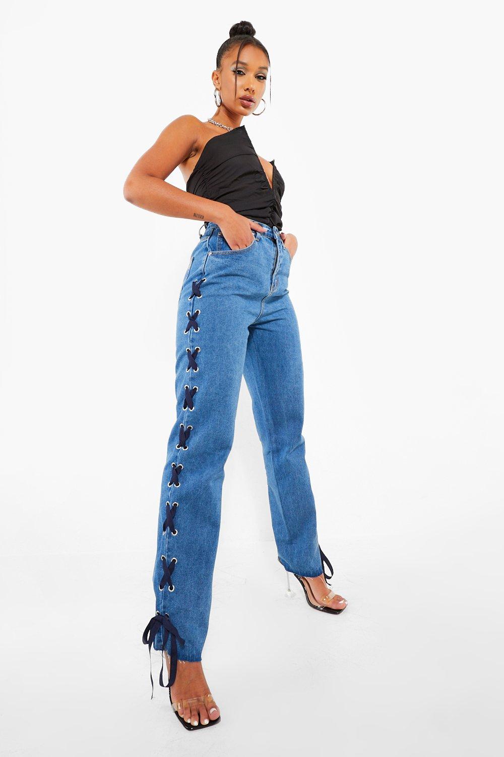 Lace up hem clearance jeans, Blue Low Rise Denim Boyfriend Fit Jeans With Spray Hem Detail clearance