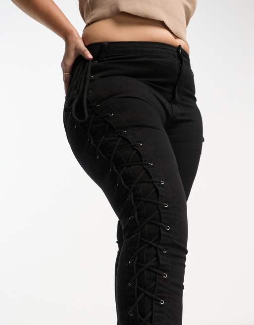 DTT Plus Saskia low rise skinny jeans with lace up detail in black