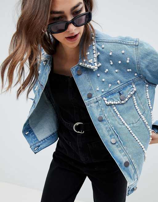 Pearl denim clearance, ASOS DESIGN denim jacket with pearl embellishment clearance