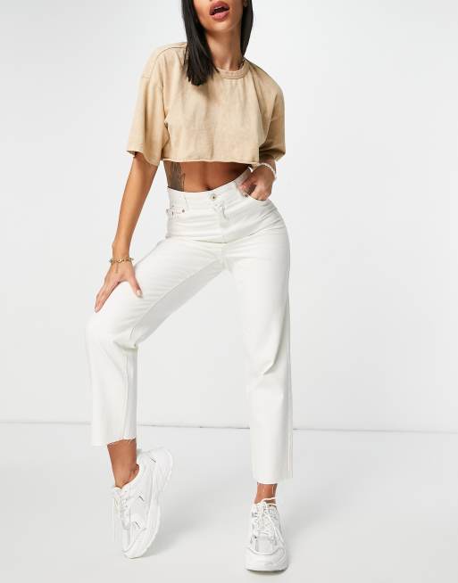 Bershka cotton paperbag waist cropped straight jean in ecru CREAM