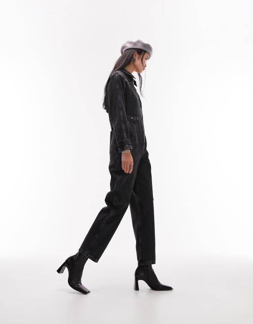Topshop denim carpenter boilersuit with adjustable waist in washed black