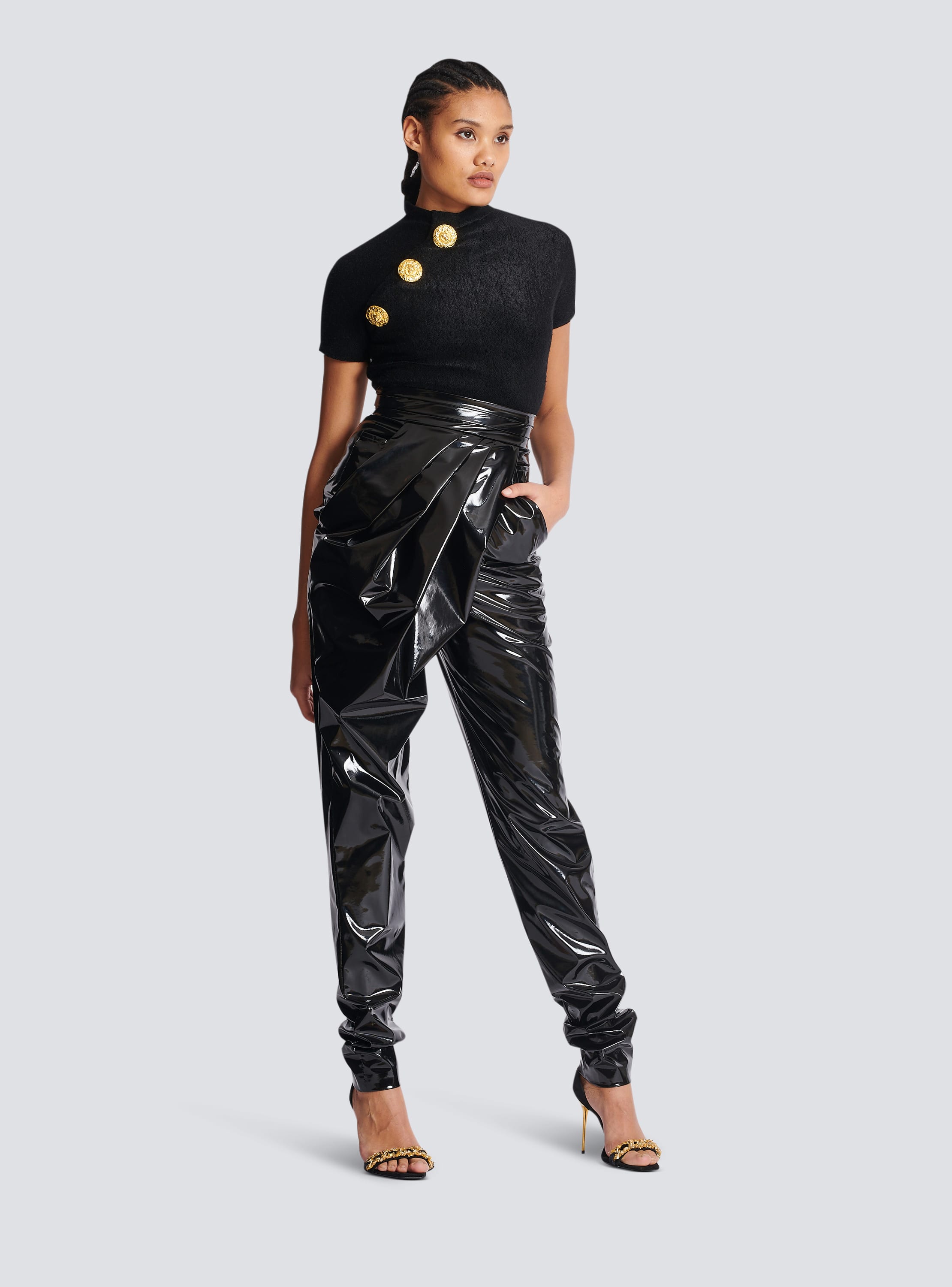 Asymmetric draped vinyl trousers black Women BALMAIN