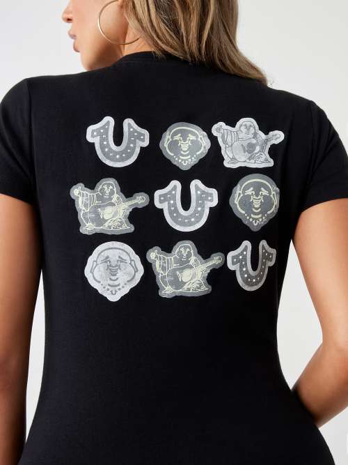 True Religion Women s Crystal Embellishment Buddha Logo Deep V Neck Tee T Shirt