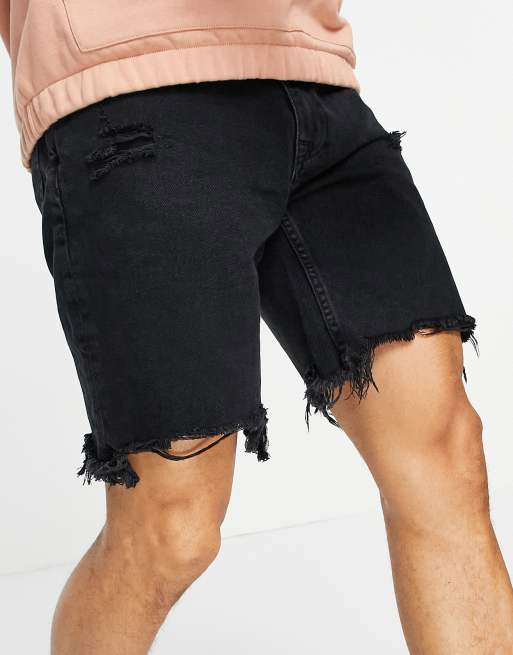Mens black skinny clearance ripped shorts, Bershka slim fit denim shorts with rips in black clearance