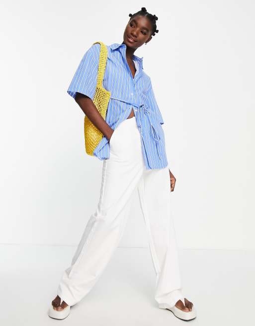 Topshop clearance striped shorts, Topshop tie waist short sleeve stripe poplin shirt in blue ASOS clearance