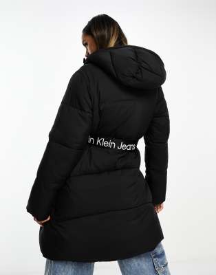 Calvin Klein Jeans logo belt long puffer jacket in black