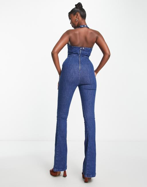 ASOS DESIGN denim power stretch halter neck jumpsuit in blue