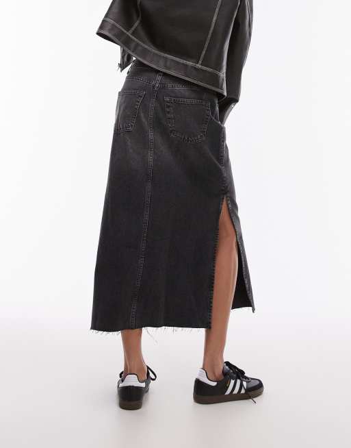 Topshop raspberry denim clearance skirt, Topshop denim midi skirt with side split in washed black clearance