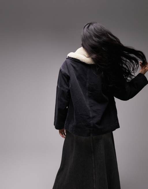 Topshop oversized borg lined cotton denim jacket in black