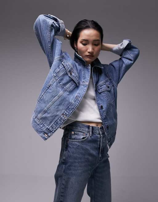 Blue denim jacket clearance topshop, Topshop denim oversized jacket in mid blue clearance